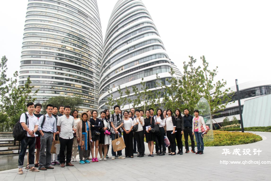考察團隨后抵達(dá)了由著名建筑師扎哈·哈迪德(Zaha Hadid)擔(dān)綱總設(shè)計師的“首都印象建筑”——望京SOHO?疾熘校瑢W(xué)員對望京SOHO項目的設(shè)計手法及細(xì)節(jié)、如何解決多專業(yè)交叉問題、如何運用流線型設(shè)計手法、如何將景觀細(xì)節(jié)與建筑相融合等諸多設(shè)計難點進(jìn)行了交流。